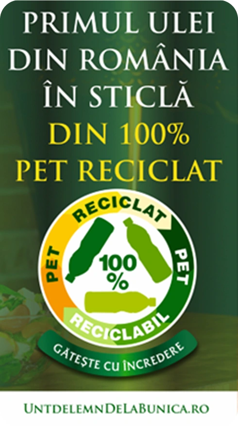 - Prin marca noastră Untdelemn de la Bunica, contribuim activ la diminuarea cantității de plastic folosit, aceasta fiind singura marcă de ulei vegetal pentru consum uman care utilizează sticle 100% reciclate și reciclabile.